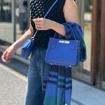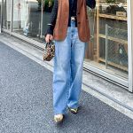オーバーサイズのジャコートをアウターに カラーニットをポイントにしたデニムコーデ。