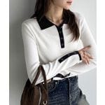 ニット素材とポロシャツのシルエットを融合させた主役級トップス。 配色デザインと金縁ボタンがアクセントになった コーデ映えするニットです。