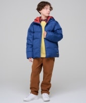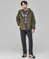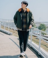 カジュアルなパーカーにロング丈のジャケットを合わせたキレカジコーデ。ジャケットの裏地のチェックでカジュアルすぎず上品な印象に。袖のグリーンをパンツで拾って多色使いでもまとまりのあるスタイリングに。