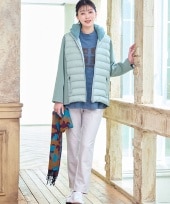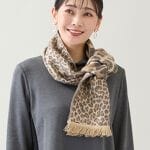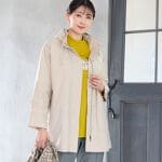 【大きいサイズ】ダウン層を内蔵したライトアウターは大人カジュアルな着こなしにピッタリ!イエローのカットソーやヒョウ柄のマフラーをアクセントにコーディネートしました。