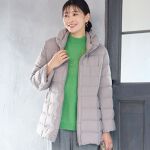 【大きいサイズ】ストレッチ性のある軽量ダウンジャケットは冬の人気アウター。ブルーのセーターに千鳥柄のパンツを合わせればシックに着こなせます。