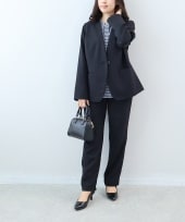上品なウールコートのきちんと感に、ラメ入りケーブルニットのほんのり華やかな表情を合わせた通勤スタイル。すっきり見えるネイビーのワイドパンツで縦ラインを強調し、フェミニンさを効かせつつ実用的。小物は淡色でまとめて洗練された印象に。