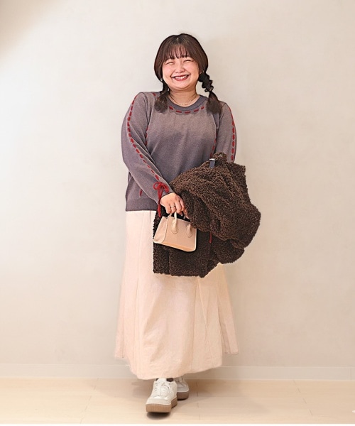 ポコポコボアブルゾンを手に持った冬の大人可愛いコーデ。赤のステッチが効いたグレーのニットが顔周りを華やかにしてくれます。スエードのフレアスカートは広がり過ぎず上品なシルエットで、スニーカーでラフさプラス。暖かく、レディライクな冬のお出かけにぴったりなコーデです!