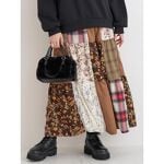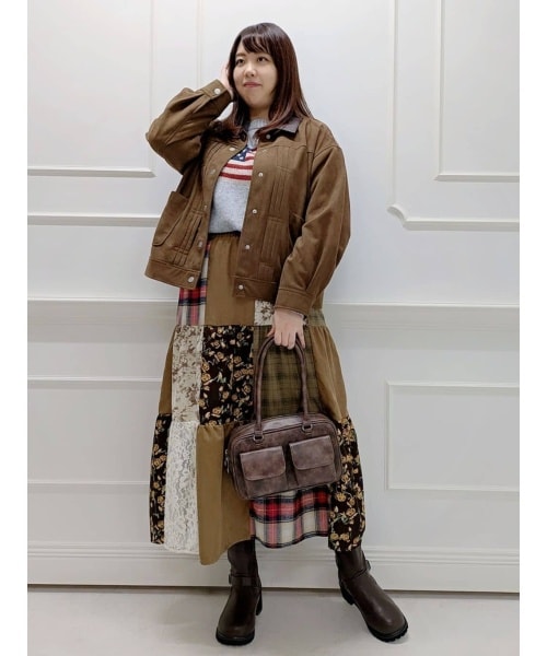 深みのあるブラウンが可愛らしいアウターは、スエード生地が軽くてサッと着やすいのがおすすめポイント! 中に着ているニットは国旗モチーフがワンポイントに!大胆なパッチワークデザインのスカートは、アウターやトップスと色味を合わせているので統一感のあるスタイリングに◎!