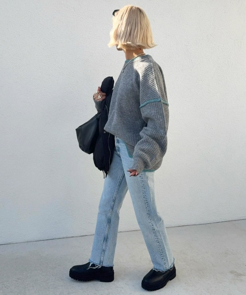 表情のある畦編みに、手編み風の配色ステッチをあしらったニットプルオーバー。 首元はモックネック、サイドスリット入りで、ほどよい抜け感をプラス。 デニムを合わせてカジュアルに、スカートと合わせて女性らしくもできる一着です。
