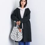 グレーのノーカラーコートは、ゆったりしたシルエットで厚手のニットも着やすいです。軽くて暖かい素材です。デニム合わせでカジュアルに。
