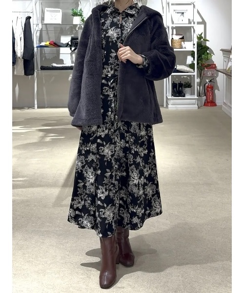 シーズン問わず着用できる万能ワンピースに、フェイクファーコートを合わせて秋冬スタイルに