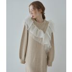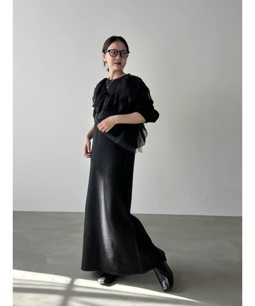 アシメフリルが華やかに格上げしてくれる人気のニットワンピース ボリューム感を抑えながらも、肩や二の腕部分は華奢見えするデザインがポイント。ブラックはMサイズを着用、ヒールなしでも引きずることなく着用できましたがSサイズを購入しました。