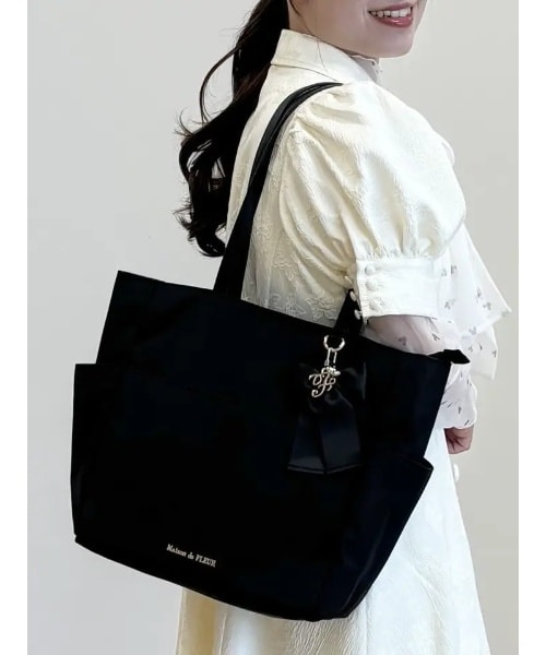 【撥水加工リボンチャームマルチポケットトートM】肩掛けしやすい長めのハンドルになっているのも嬉しいポイント!ファスナーが付いて、ポケットもたくさんついていて機能性・容量共に大活躍するバッグです♪