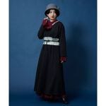 着物に倣(なら)った形のワンピース。 ウエストのジャカード生地は、着物の帯をイメージしたデザイン。 バックスタイルには、カヤオリジナルデザインの花刺繍の洒落紋入り。 落ち着いた色味で上品な和モダンスタイルに◎