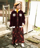 有名なニットの産地・新潟県見附市でつくられたオーバーサイズのニット羽織と、鉄線(てっせん)の花模様を大胆にあしらった華やかなワンピースのコーディネート。 着物代わりにハレ着としてもご着用いただけます。大人な和モダンスタイルに。