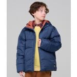 ブルーのダウンが主役のコーデ。子供らしい元気な配色感に、チェックのシャツでレイヤードしたお洒落なスタイリング。