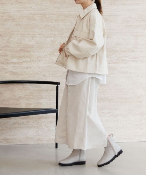 卑弥呼のあたたかブーツ。筒裏のボアが暖かく、サイドからのぞくボアがワンポイント。グレージュのブーツ×淡いワントーンの洋服を合わせた、冬のワントーンコーデ。