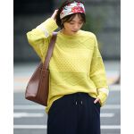 レモンカラーのニットが主役の華やぎコーデ。 濃紺パンツで大人っぽく引き締め、柄スカーフで顔まわりも明るく。歩くだけで気分が上がる冬のきれいめスタイル。