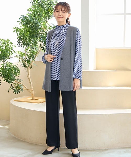 暖か素材のベスト&パンツで寒い季節もきちんと感をしっかりキープ。ロングベストは縦ラインが強調できスタイルアップが叶います。