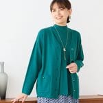 ニットアンサンブルで楽しむカラーコーディネートスタイル。深みのあるグリーンが華やかな印象を与えてくれます。