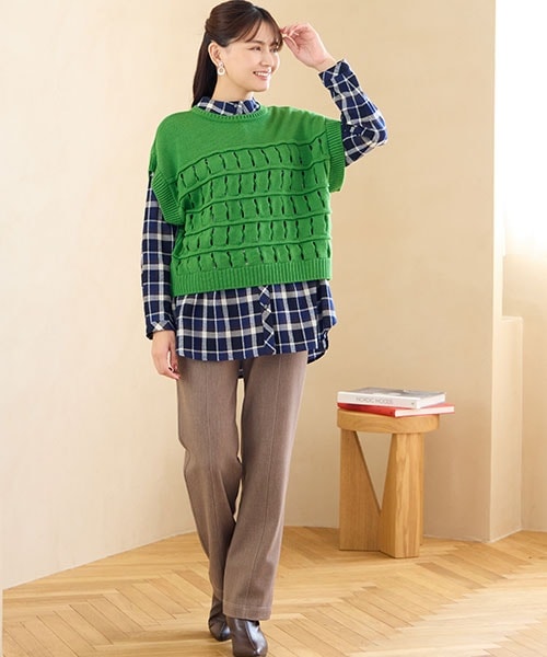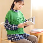 チェックシャツにグリーンのニットベストを重ねた温もりレイヤードスタイル