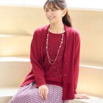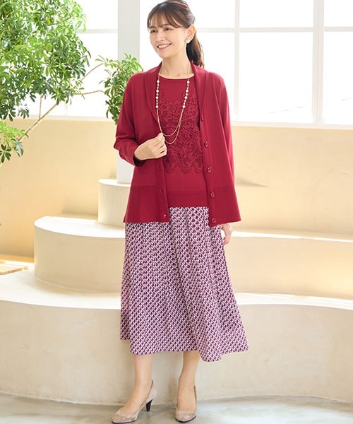 ボルドーのワントーンコーディネートで華やかに!ニットアンサンブルと揺れ感スカートでフェミニンな着こなしです。