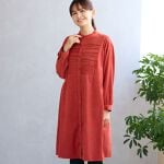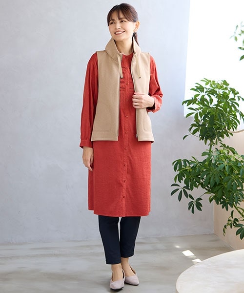 シャツワンピにカジュアルなベストを合わせたレイヤードスタイル