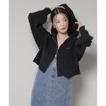 モノトーンのカジュアルコーデ! 重すぎないニットフーディーなので、アウターの下の着用も可能な1着。
