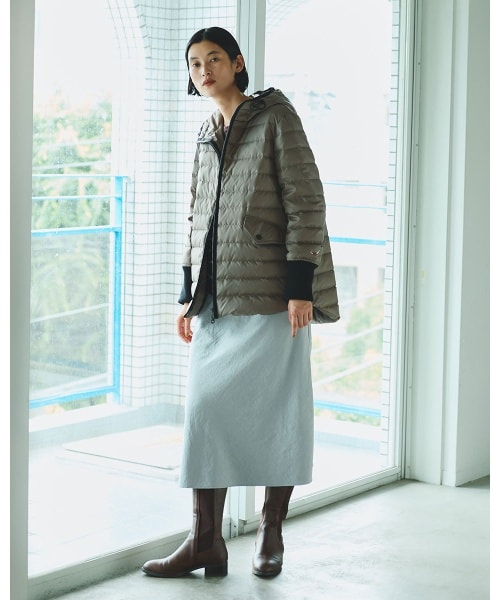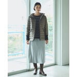 淡いグレーのスカートに軽やかなダウンを合わせた上品カジュアルコーデ。柔らかく女性らしいシルエットで冬のおでかけにぴったり。