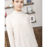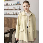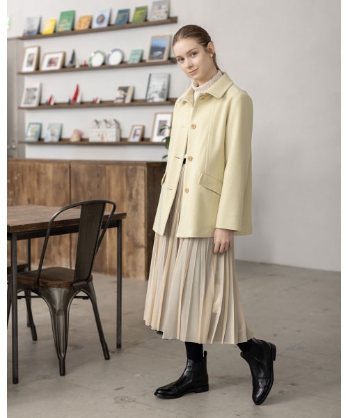 淡いクリームカラーでまとめた柔らかコーデ。軽やかなプリーツスカートに、上品なショートコートを合わせて女性らしさを引き立てる冬のきれいめスタイル。