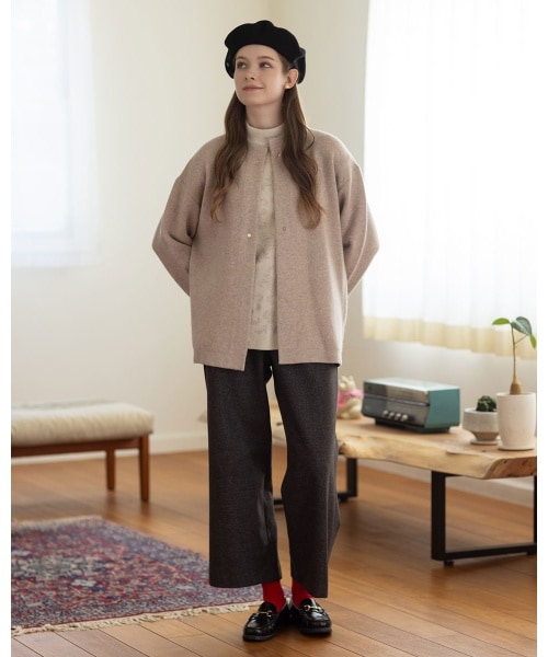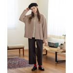ベージュ×ブラウンのやわらか配色でまとめた冬のリラックススタイル。ゆったり羽織れるアウターと上品なワイドパンツが、大人の抜け感を演出します。