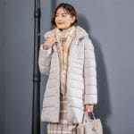 ニットセットアップに、昨年大人気だった中綿アウターの新色「モカブラウン」を合わせました。上品な光沢感があり、プリンセスラインのすっきりシルエットなのできれいめコーデにぴったり。襟の内側がフェイクファーで首元までしっかりあたたかです。撥水加工で急な雨や雪にも安心です。