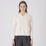 フェイクファーのふわふわポケットがポイントのニットプルオーバーです。広めの身巾とドロップショルダーで、ゆったりとしたシルエットです。襟ぐりは、程よい開き具合のVネックです。衿ぐり後ろのクレストブリッジチェックがさり気ないアクセントになります。