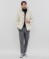 キルティングコートを羽織ることで軽快さと上品さを両立させたスタイルです。立体的なダイヤステッチが表情を生み、シンプルなインナーとスラックスの組み合わせに奥行きをプラス。ブラックのキルティングが全体を引き締めつつ、ほどよい光沢感が都会的な印象を与えます。