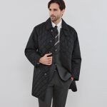 キルティングコートを羽織ることで軽快さと上品さを両立させたスタイルです。立体的なダイヤステッチが表情を生み、シンプルなインナーとスラックスの組み合わせに奥行きをプラス。ブラックのキルティングが全体を引き締めつつ、ほどよい光沢感が都会的な印象を与えます。
