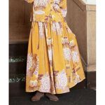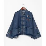 幾何学模様のジャカード生地にデニムをプラスした、遊び心たっぷりなデザインのショートカーディガン。 象の柄がレトロでオリエンタル★コーデュロイのロングスカートをコーディネート。