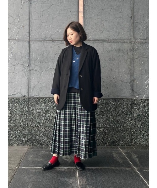 ジャケットでカチッとしつつ華やかな雰囲気のコーディネート。 プリーツスカートと合わせて少しキレイめな印象です。 ジャケットはウール100%なので見た目以上に暖かく、シーズンも長く活躍しそうです!