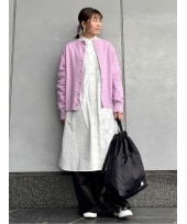 フード付きリバーシブルコートを主役にした大人カジュアルコーデ。ナイロン面にはアクセントにスワン刺繍、袖口やフード裏から覗くボアがポイントに。ボア面はパッチポケットで可愛らしさをプラス。ロゴ刺繍入りシャツと、ユーカリ柄のキュロットを合わせ、上品で遊び心あるスタイリングです