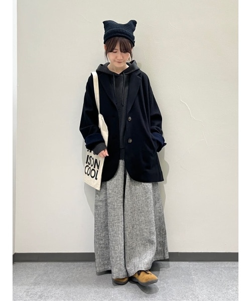 大人のモノトーンスタイル。レーヨン混のフーディニットは品のある質感でカジュアルになりすぎず、滑らかで快適な着心地。圧縮ウールのテーラードジャケットを羽織ればきちんと感もプラス。ボトムのフレアーマキシパンツはツイード見えする生地が上品で、抜け感ある大人コーデに仕上がります。