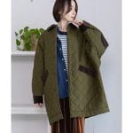 お袖と衿のコーデュロイ切替が可愛い軽量キルティングコートはオーバーサイズでヒップラインも隠れ、防寒性も◎ JOiEロゴのもちもちニットとセミフレアデニムスカートを合わせ、キャップの遊び心ある刺繍でカジュアルに仕上げた冬の大人可愛いスタイルです。