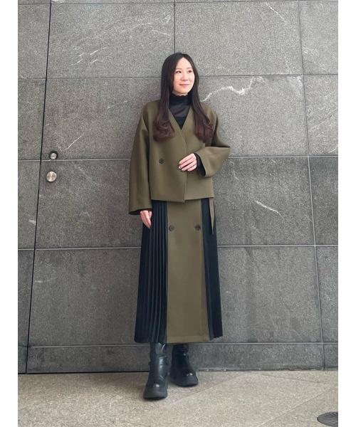 程よい膨らみのある素材を使用したダブルノーカラージャケット。 オンオフと様々にカーディガン感覚でカジュアルなスタイリングでもお召しいただけます。