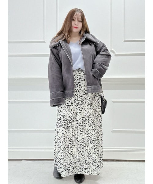 アウターは1枚持っておくと大活躍なムートンファージャケット!とにかく軽い着心地が魅力です◎トップスは、深めにあいたVネックが特徴の畦編みニット! カラーの展開が豊富なので、色違いで集めていただくのもおすすめ♪ スカートは、ダルメシアン柄が可愛いプリーツロングスカート!