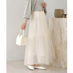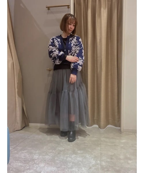 フラワーモールカーデは、程よい厚さでアームがゆったりあるので、インナーを気にせず羽織れます! チュールスカートは、ティアードがポイントで、大人フェミニンに使えるスカートです!