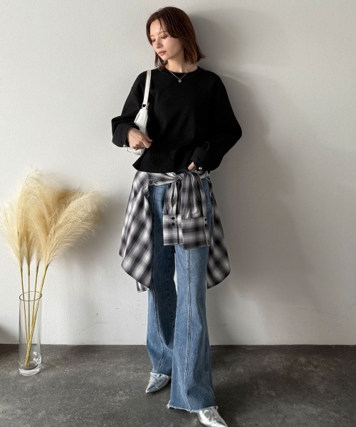 最旬美脚デニム。裾フリンジデニムセミフレアパンツ