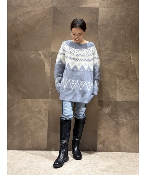 風合いの良いニットを使用したジャガードニット。ジャガード編みは糸が重なり重くなる事もありますが、こちらは甘めに編んでいるので柔らかいです。広めの襟ぐりなので肩を落として着る事も可能です。