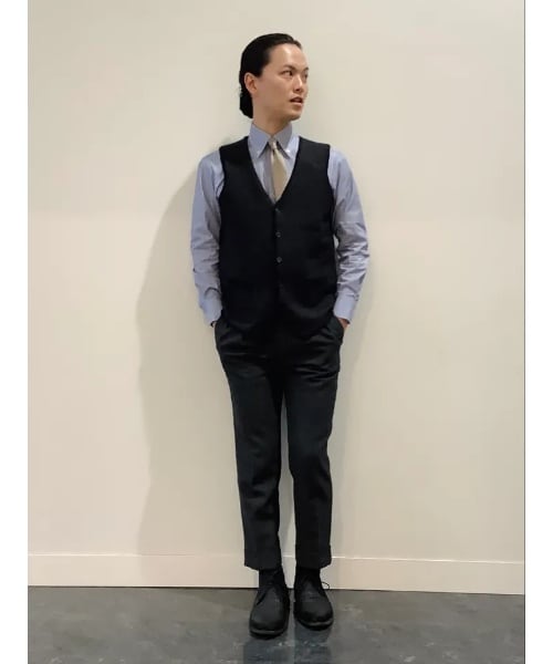 今回のテーマは“雨の日のコーデ”です☆ ベスト×パンツはスタイリッシュに見せたいので、ネイビーやグレーをチョイス♪ シャツやネクタイは明るいブルーとベージュで雨の日でも気分が明るくなるようにコーディネートしました。