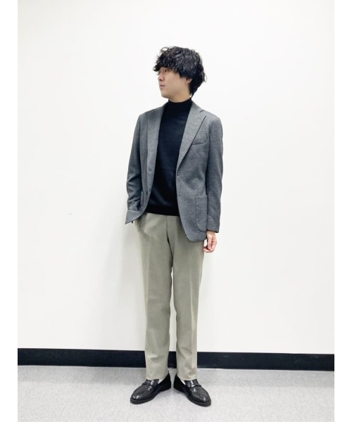 シンプルながら計算された上品さを目指したスタイルです。グレーのジャケットにブラックのタートルネックを合わせ、落ち着いた印象にしました。さらに、ベージュのスラックスを組み合わせることで全体のトーンが柔らぎ、モノトーンの重たさを程よく中和しています。