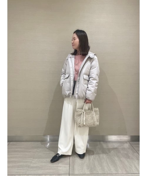 重くなりがちな冬に淡いカラーとピンクを合わせた明るめコーデ。サテン地のダウンコートは上品な光沢もあり、高級感のある素材です。 ピンクのニットはウール100%でふんわり暖かさ♪オールゴムなのにキレイめに見えるジャージーパンツと合わせたカジュアルスタイリングにしてみました。