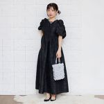 ドレスブランド<ANDRESD>で人気のバブルスリーブ ジャガードドレスを別注。 ボリューム感を調整できるように後ろにスピンドルを加えて、ウエスト周りのラッフルをなくしてスッキリ着用できる仕様にしました。
