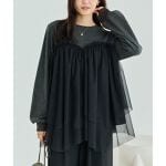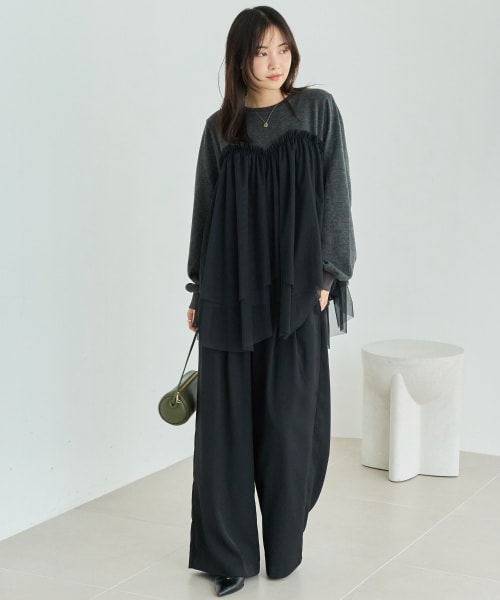 チュールをドッキングした異素材デザインで、2枚重ねのふんわりとしたチュールが自然に体型をカバーしてくれます。身頃はニットのような表情のカットソー素材で、甘すぎず大人っぽい印象に仕上げています。