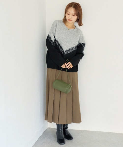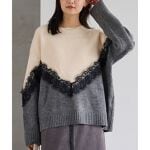 1枚で存在感のあるバイカラーデザインに合わせた繊細なレースがポイント。スリーブ部分まで施されたレース切替で、華やかなスタイリングに。身幅があり、ゆったりとした着心地です。
