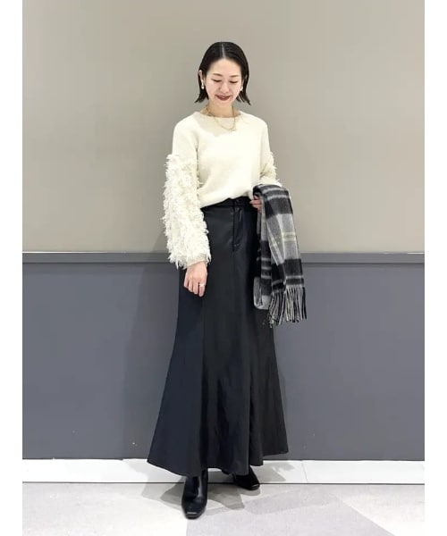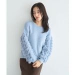 ラメの光沢が上品にきらめき、フェザーとフリンジが動くたび表情を変えるクルーネックニット。軽さと暖かさを両立した素材で、肌触りがよくリラックスした着心地です。身頃と袖で編み方を変え、遊び心をプラス。