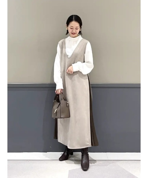 Vネックのジャンパースカートとブラウスの2点セット。ジャンスカは薄手のスエード素材で着心地も柔らか。サイドのプリーツが軽やかな動きを演出します。