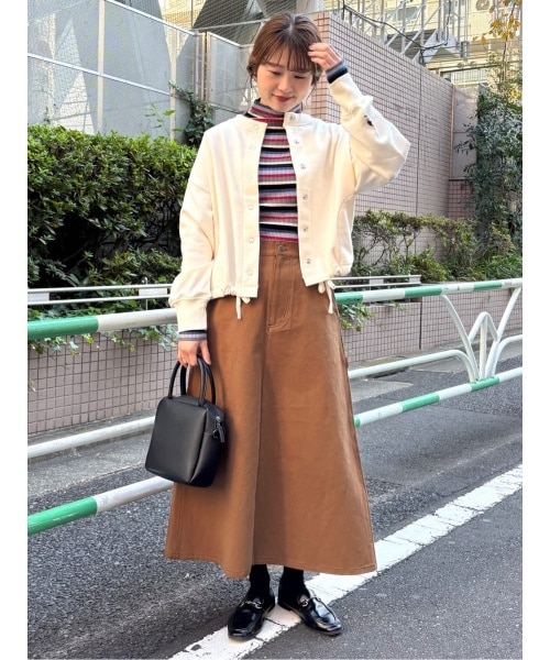 裏毛生地を使用したカーディガンは丈感も程よくロングシーズン活躍します。デイリー使いしやすいペインタースカート生地が軽めなので広がりすぎず綺麗な形に◎オールシーズン活躍する一着です。インナーにマルチボーダーのニットを合わせてアクセントに!